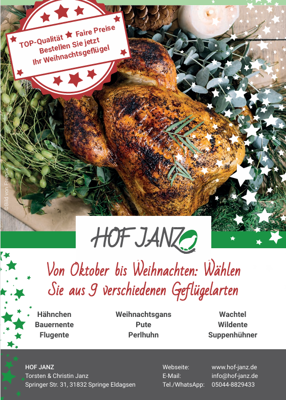 Herzlich Willkommen! Wir sind Torsten und Christin Janz und führen unseren kleinen landwirtschaftlichen Betrieb in Eldagsen, rund 30 km südlich von Hannover. Bei uns erhalten Sie frische Eier und frisches Geflügelfleisch aus eigener tiergerechter Haltung.